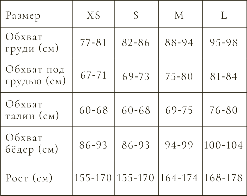 Снимите мерки тела измерительной лентой. Измерьте в сантиметрах обхват груди и обхват под грудью. Делайте это в расслабленном состоянии тела, голыми, либо в тонком лёгком белье. Сравните измерения с размерной сеткой - таблицей ниже. Определите подходящий Вам размер: XS, S, M или L. Добавляя лиф в корзину, в графе «размеры» укажите выбранную Вами букву.